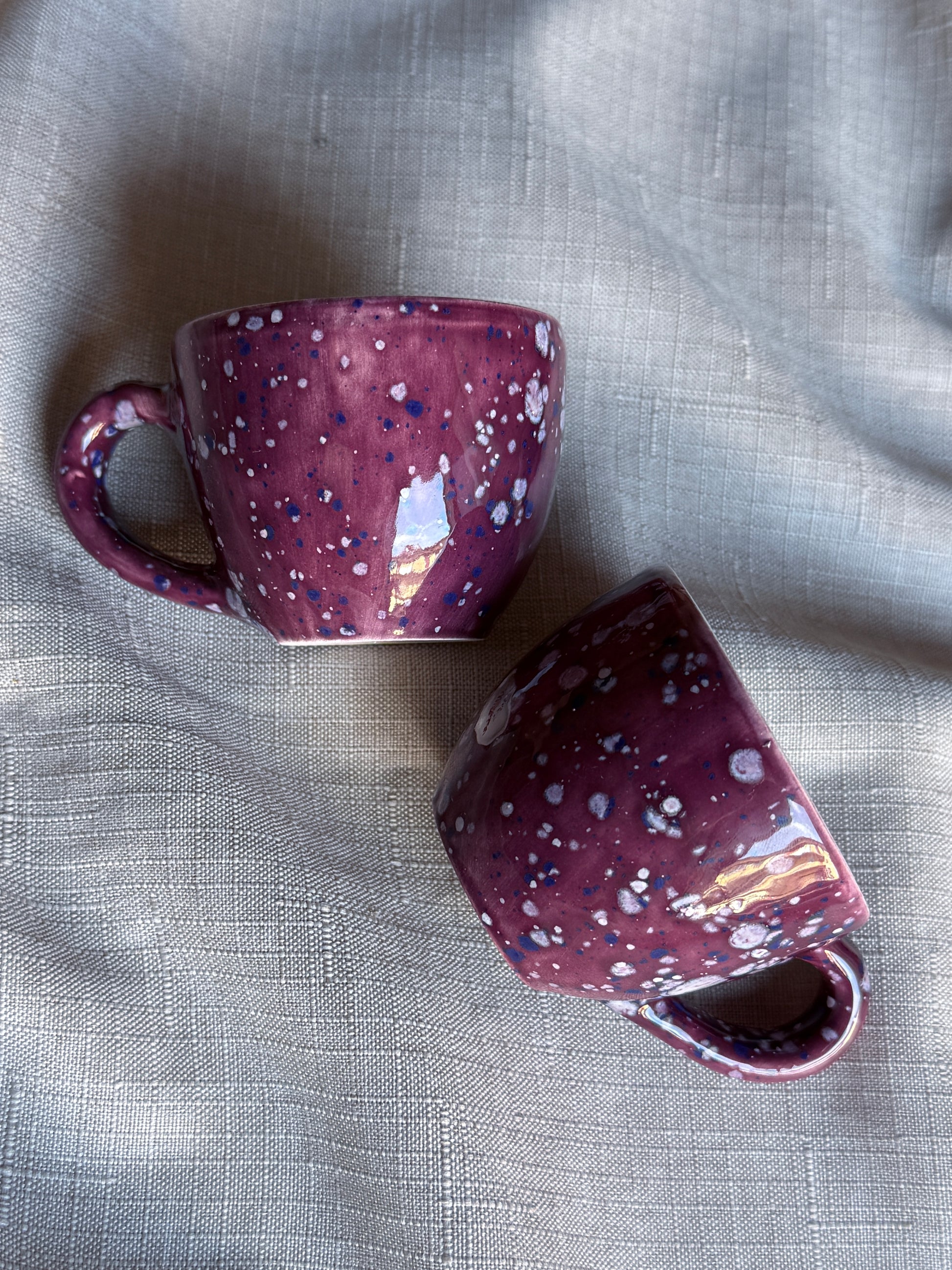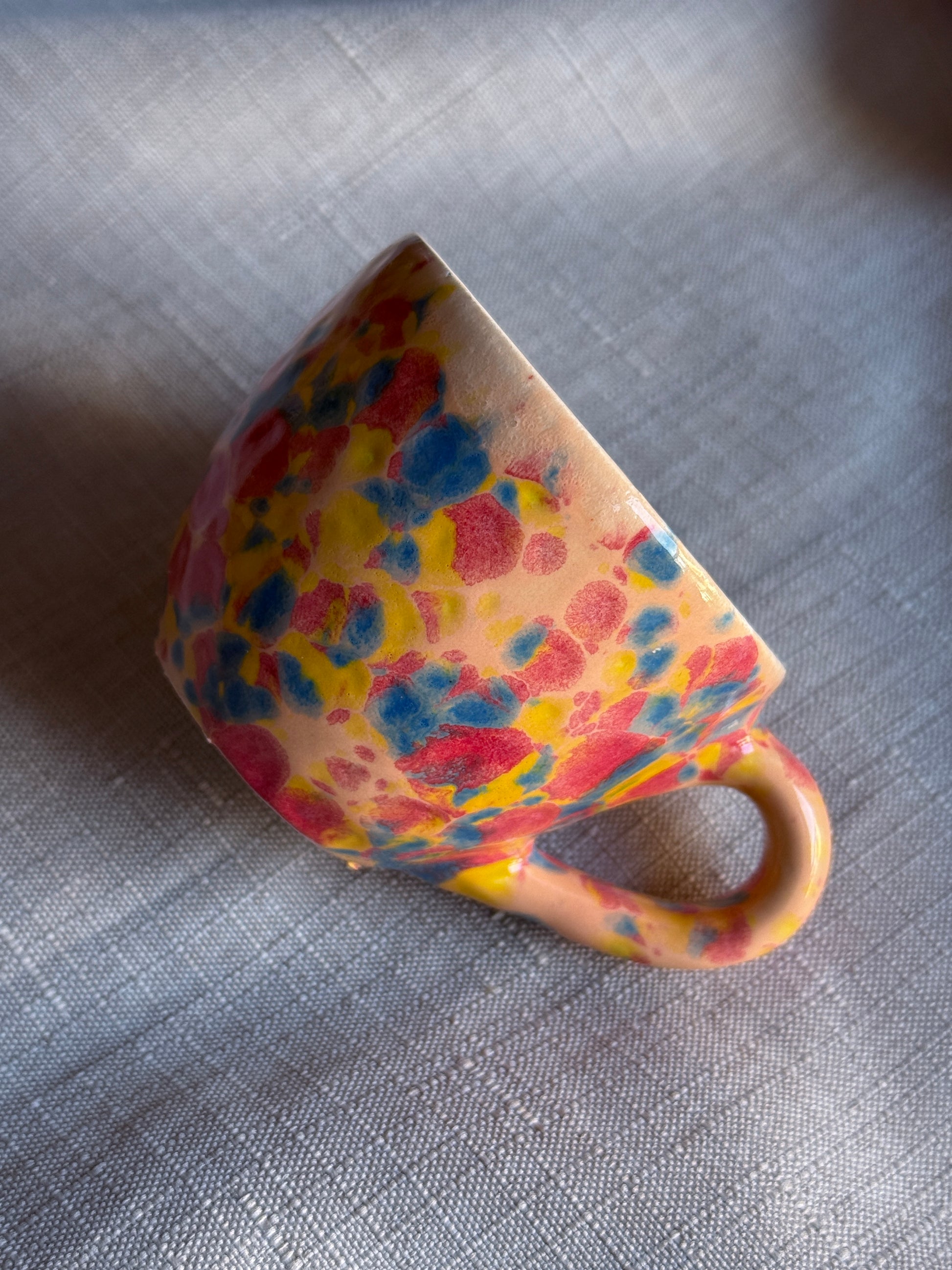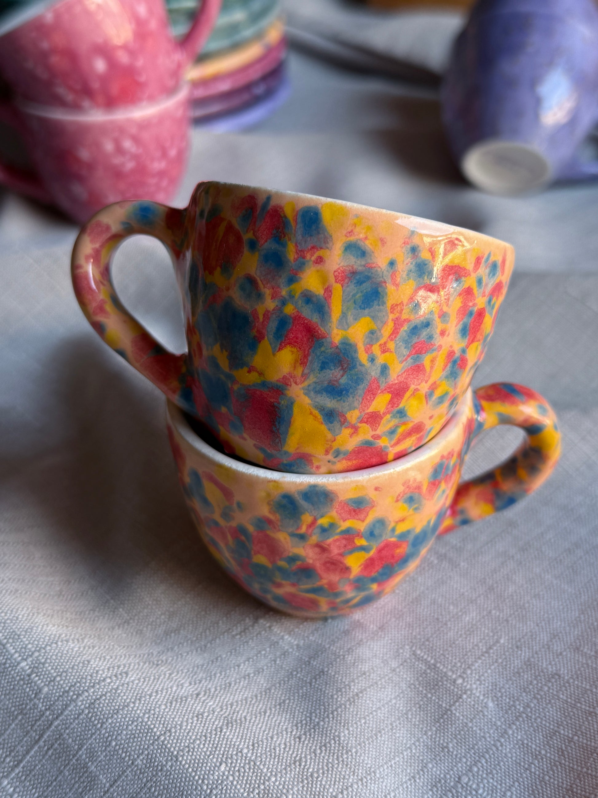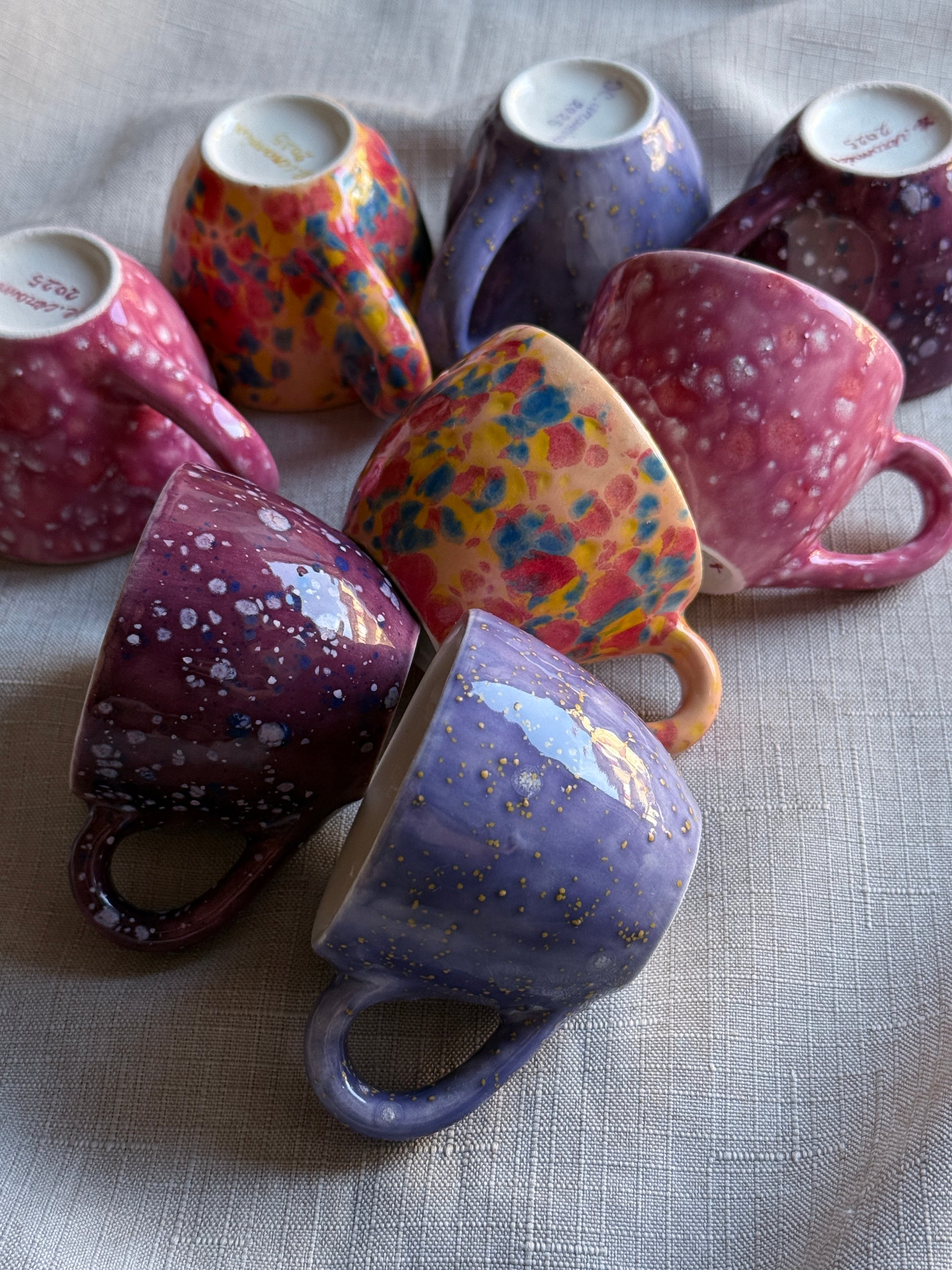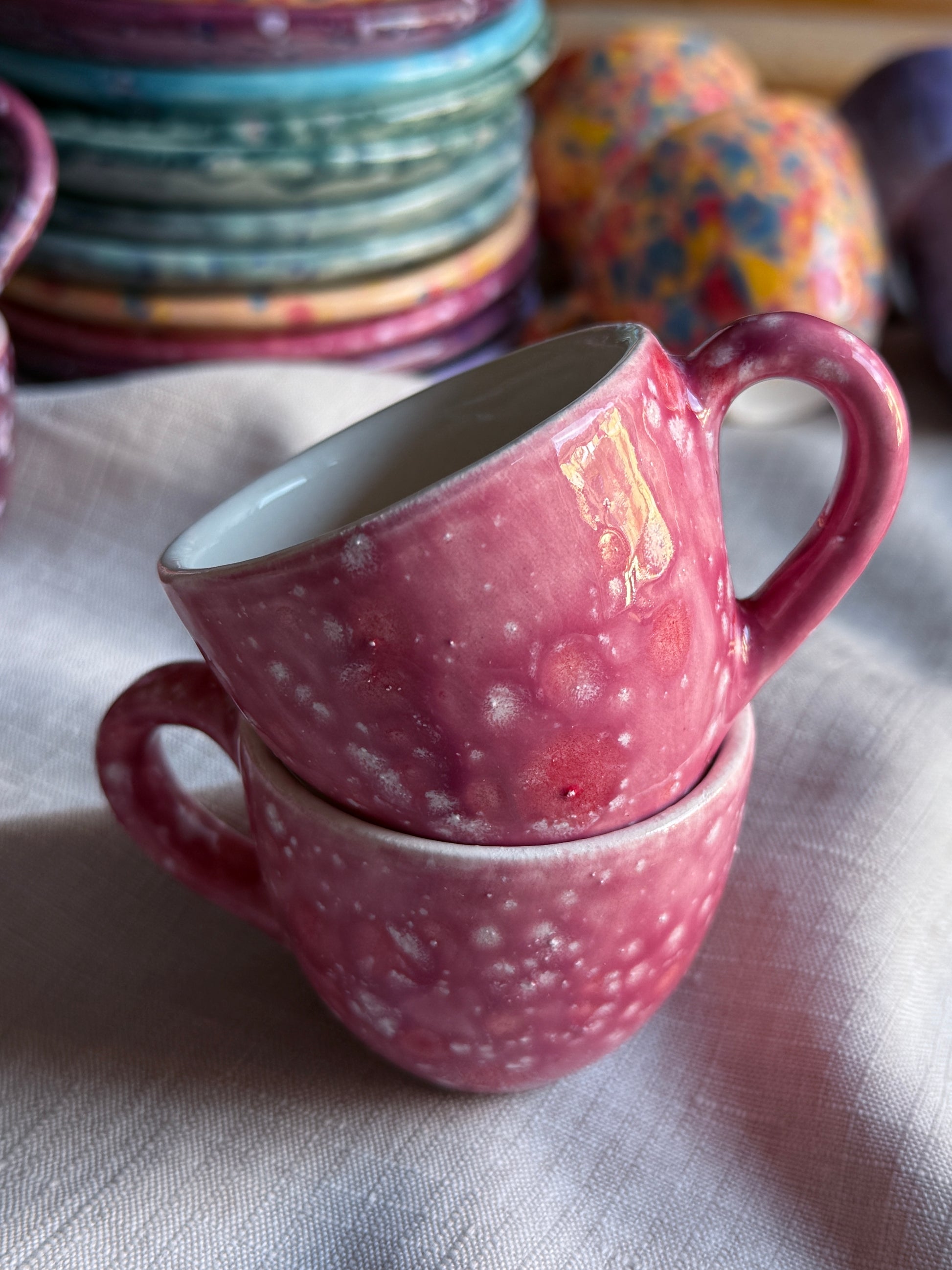 Caleido è una collezione di tazzine in ceramica artigianale smaltati a mano, ispirata ai colori cangianti delle gemme e ai giochi di luce di un caleidoscopio. Ogni pezzo è unico, vibrante e pieno di energia, pensato per portare allegria e bellezza sulla tavola.