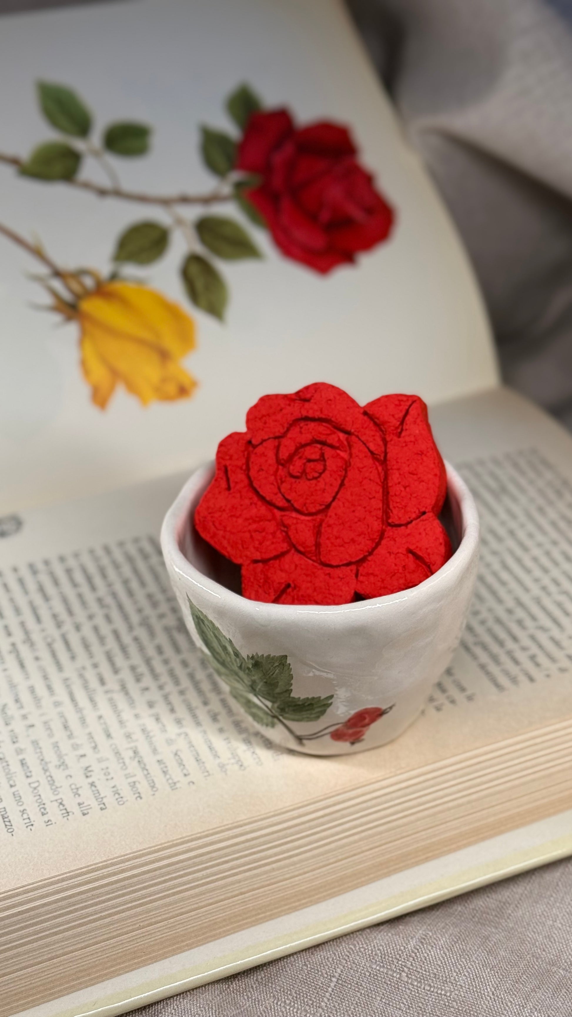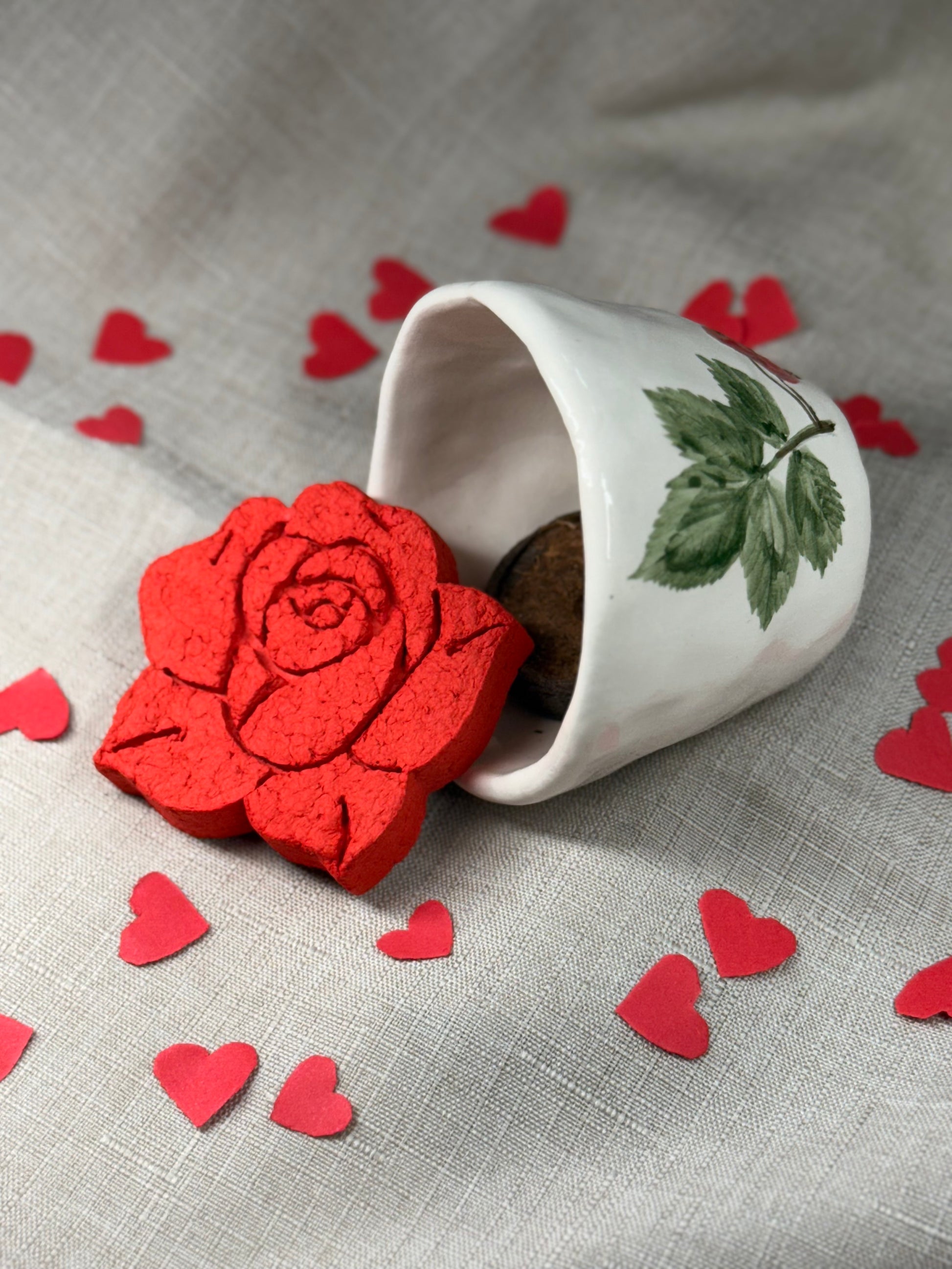 Vasetto in ceramica modellato e dipinto a mano con impressione di vere piante + rosa in carta riciclata modellato a mano con all’interno semini di piante amiche delle api